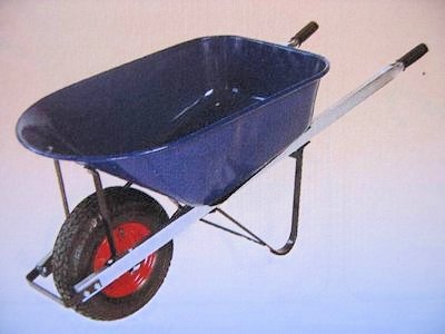 1. A wheelbarrow. Some now come equipped with two wheels for improved balance and some now with motors. Our barrow has four wheels and a motor.