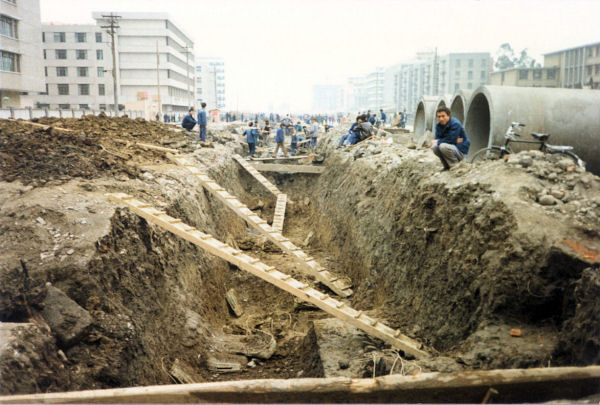 Chinese Construction - Methods and Materials 33. Drainage Ditch in Chengdu, Sichuan The city of Chengdu is constructing the Circle Road (Yi Wan Lu) around the city. Part of that construction is a drainage ditch along side the road. The ditch is 10 feet deep and about 12 miles long. It was dug entirely by hand and the dirt removed by laborers. The four-foot concrete pipes will then be laid in the ditch. We had to cross over this ditch each day on a narrow plank. The sloping planks are for the men to climb when removing the dirt. The time Paul had to be taken to the emergency hospital the car had to navigate across this ditch. ⇦ Back to Page 32 On to Page 34 ⇨Hi-Res Pic (239K) Return to Construction - Page 5 |