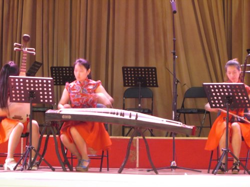 Sias University 15th Anniversary Banquet - Scene 11 Zheng Entertainment During the Banquet This performer plays a Chinese musical instrument called a Zheng. The Zheng has an arched surface and is elongated-trapezoidal with 13 to 21 strings stretched over individual bridges. Although metal strings are common today, the strings were of silk in ancient times. ⇦ Back to Scene 10 On to Scene 12 ⇨Return to Sias University 15th Anniversary Banquet Page 2 |