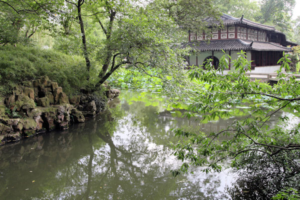 Humble Administrator's Garden 11. Garden Waterway Crossing a winding bridge at the northeast corner of the building and following a small path eastward, the visitor comes to Lu Yi Ting (Green Ripples Pavilion). Turning southward, the long corridor brings one to Wuzhu Youju (Secluded House of Bamboo). Moon gates on all four sides of this pavilion provide frames for some exquisite scenery. Grossing a flat bridge to the northwest, one sees Dai Shuang Ting (Waiting-for-the-Frost Pavilion) perched on the East Hills. Then, southwest across a small bridge with stone banisters, one comes to Xiu Qi Ting (Embroidered Silk Pavilion) in the shade of ancient trees on the small hills east of Distant Fragrance Hall. South of it is Pipa Yuan (Loquat Garden). ⇦ Back to Page 10 On to Page 12 ⇨Hi-Res Pic (282K) Return to Garden Scenes Page 2 |