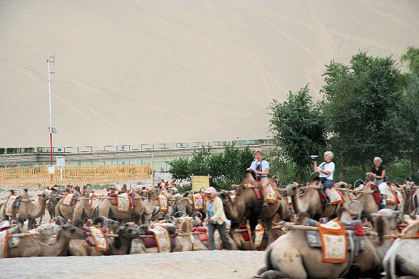 Crescent Moon Pool 3. Camel Riding There was a certain amount of milling around while people and camels got sorted out. Eventually all got paired up and a string of camels set out. They are all tied together with a gude leading at the front. ⇦ Back to Page 2 On to Page 4 ⇨Hi-Res Pic (179K) Return to Crescent Moon Pool Page 1 |