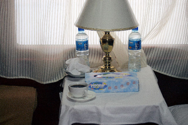 Travel Quest Special Train Xi'an to Xinjiang Eclipse 2008 Compartment Table - 4 The interior of the train was most elegant. In your compartment were two bunks, an upper and lower. At the window was this convenient table with a table cloth. On the side was a soft comfortable chair. They supplied bottled water. ⇦ Back to Scene 3 On to Scene 5 ⇨Hi-Res Pic (148K) Back to Special Train Thumbs - Page 1 |