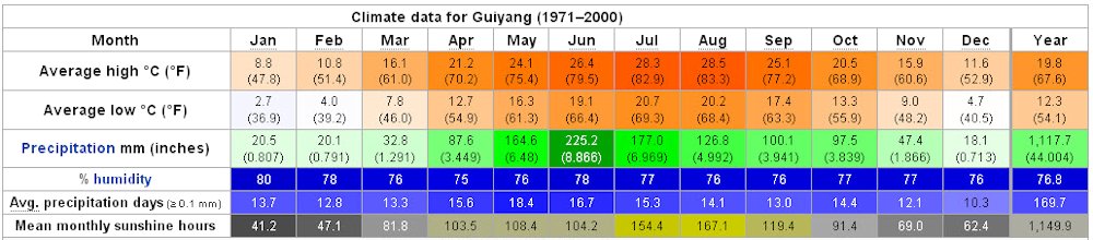 Yearly Weather for Guiyang, Guizhou, China Guiyang has a four-season, humid subtropical climate, tempered by its low latitude and high elevation. It has fairly mild winters, very warm summers and a monsoon season, where the majority of the year's 1,120 millimeters (44 in) of precipitation falls; the seasons are not particularly distinct, with frequent unseasonable cold or warm spells, but extreme temperatures are rare. The mean temperature in January is 5.1 °C (41.2 °F) and for July 23.9 °C (75.0 °F). Rain is common throughout the year, with occasional flurries in winter. At only 1150 hours of sunshine, it is also one of China's least sunny cities. Relative humidity is consistent throughout the year. Return to Yearly China Weather Choices - Page 2 |