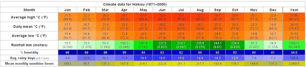 Yearly Weather for Haikou, Hainan, China April to October is the active period for tropical storms and typhoons, most of which occur between August and September. May to October is the rainy season with most rainfall coming in September. Despite its location, the city has a humid subtropical climate, falling just short of a tropical climate. Nevertheless, the area has hot summers and warm winters, usually with high humidity. Extremes temperatures have ranged from 2.8 to 42.0 °C (37 to 108 °F). Return to Yearly China Weather Choices - Page 2 |