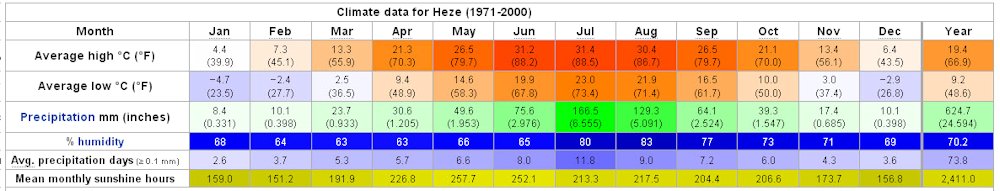 Yearly Weather for Heze, Shandong, China Heze has a monsoon-influenced climate that lies between the humid subtropical and humid continental zones, with four well-defined seasons. Conditions are warm and nearly rainless in spring, hot and humid in summer, crisp in autumn and cold and dry in winter. The mean annual temperature is 13.7 °C (56.7 °F), with monthly 24-hour averages ranging from -0.9 °C (30.4 °F) in January to 26.8 °C (80.2 °F) in July. Rainfall mainly occurs in summer; snow occasionally falls during winter, though heavy falls are very rare. Return to Yearly China Weather Choices - Page 2 |