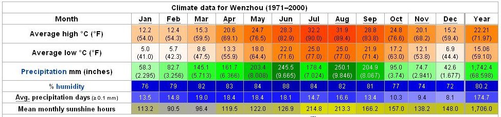 Yearly Weather for Wenzhou, Zhejiang, China Wenzhou derives its present name from its mild climate. Wenzhou has a humid subtropical climate with short, mild, dry winters and long, hot, humid summers. Summers are similar to the remainder of the province, but winter is much milder, partly due to the southerly location and partly due to the sheltering effect of the surrounding mountains. Mean monthly temperatures range from 8.0 to 28.0 °C (46.4 to 82.4 °F) in January and July respectively. Heavy rainfalls occur in late spring and early summer due to the monsoon, while typhoons are common in late summer causing considerable damage and destruction. Return to Yearly China Weather Choices - Page 2 |