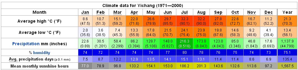 Yearly Weather for Yichang, Hubei, China Yichang has a four-season, monsoon-influenced, humid subtropical climate, with cool, damp and generally overcast winters, and hot, humid summers. Monthly mean temperatures range from 4.9 °C (40.8 °F) in January to 27.7 °C (81.9 °F) in July, with an annual mean of 16.9 °C (62.4 °F). Sunshine is a bit on the low end, with winter being the cloudiest season, yet rainfall is concentrated from May to September. Return to Yearly China Weather Choices - Page 3 |