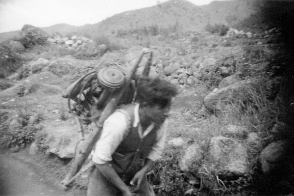 (Future Beason Site) 2. Koreans Carry Equipment to Hill 1157 The local police station and I would try to select able-bodied men because they would have to do some heavy carrying of loads 10 miles up the 4000-foot mountain. Some of the loads were as heavy as 400 pounds. That kind of load we would use two men to spell each other. Someone would have to go with each group to make sure everything arrived and nothing disappeared enroute. The backpack these men are using is the Korean Chige (Chee gay). This man is carrying the motor to our power generator. Hi-Res Pic (139K)⇦ Back to Scene 1 Return to Page 1 On to Scene 3 ⇨ |
