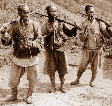 Three Korean get ready to go tiger hunters in the hills outside of Seoul.