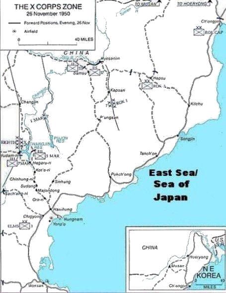 Korean War Maps Map of X Corps Zone in North Korea This map shows the overall area facing the X corps. Note the few roads. Most of them are unpaved and single track. In addition they are in poor condition. Many are not suitable for heavy transport. Return to Korean Map Choices |