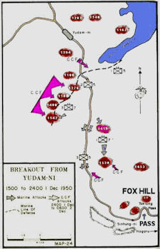 52. Map Showing Toktong Pass The road from Hagaru to Yudami-ni climbs from the tableland at the foot of the Chosin Reservoir and winds its way up to 4,000-foot Toktong Pass. Descending through gloomy gorges, it finally reaches a broad valley leading to Yudam-ni, where roads branch off to the north, west, and south from a western arm of the Reservoir. Fox Hill controls the road through Toktong Pass. The Marines must take Fox Hill to allow the 5th and 7th Regiments to reach Hagaru. And if 1st Regiment wants to survive at Hagaru and then breakout to the south they need the help of the 5th and 7th. The plan of the CCF is to isolate the three regiments and then piecemeal destroy each of the isolated groups at Yudam-ni, Hagaru, Koto-ri and Chinhung-ni. ⇦ Back to Page 51 On to Page 53 ⇨Return to Sgt Smith - Page 7 |