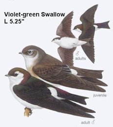 Violet-green Swallow Tachycineta thalassina - Common in mountains and locally in towns. Best told by large white flank patches, which nearly meet over the tail. Adult is confused with the Tree Swallow or White throated Swift. Violet-green Swallow flaps more rapidly than the Tree, glides less, has translucent wings and a shorter tail. Young are brown and have less conspicuous eye patch. Call is a rapid twitter. Click for a Photo of our Bird |