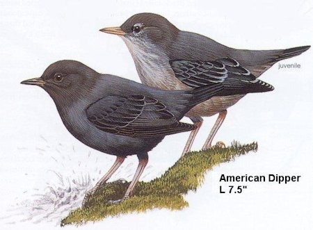 American Dipper Cinclus mexicanus - Fairly common among the larger, rapid mountain streams. Told by sooty plumage, short cocked tail, white eyelids. Bobs up and down. Walks under water. Flight low and direct. Song long, melodious, with trills and repetitions. |