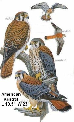 American Kestrel Falco sparverius - The smallest and most common falcon of open and semi-open country. The only falcon with two "whiskers" on each side of face and the only one with a rusty back. Hunts from poles, wires, or trees; frequently hovers. Eats insects primarily. Call, a sharp killy killy killy. Look at Next Bird Return to Likely Bird List - Page 5 |