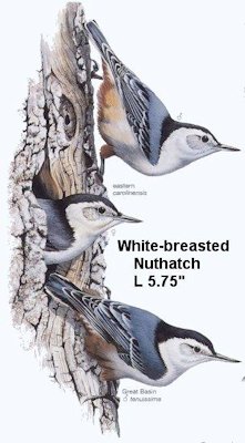 White-breasted Nuthatch Sitta carolinensis - Common in deciduous woodlands. Except for the white throat, resembles chickadee in plumage, though not in shape, or actions. Note the white face and solid black cap of male (gray in female). Call, a low yank-yank. Song, a 5-15 low rapid notes, given 6-15/min. Look at Next Bird Return to Likely Bird List - Page 6 |