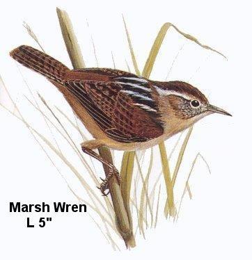 Marsh Wren Cistothorus palustris - Abundant in its limited habitat. Marsh and Sedge Wrens are quickly told from other small wrens by their streaked backs. This species also has a solid rusty cap and a distinct white line over the eye. It is seldom found far away from cattails, rushes, sedges, or tall marsh grasses, Song is 1-3 musical rattles on different pitches, often preceded by a faint nighthawk-like buzz, 10-16/min. Look at Next Bird Return to Likely Bird List - Page 11 |