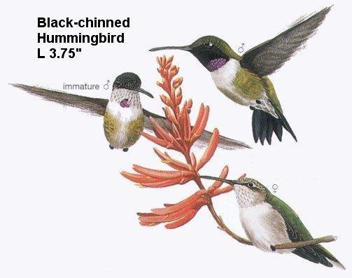 Black-chinned Hummingbird Archilochus alexandri -- Common in western mountains, This is our only hummer with a truly black throat; throats of other species may look black in poor light. White below the purple stripe confirms this species. Often captures insects flycatcher-fashion. Female has no rufous on sides and tail. Call-a slurred thew. |