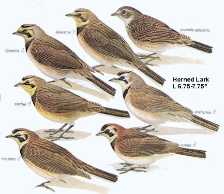 Horned Lark Eremophila alpetris - Common in large fields, at the shore, and in other open places. Recognize adults by the black breast mark and facial design; immature shows these marks less distinctly. In normal flight, low and slightly undulating, notice the black tail feathers. Feeds in winter in freshly manured fields. Song, weak, high pitched, is repeated many times (9-13/minute) in a single flight overhead. Winter call, faint tinkling notes. |