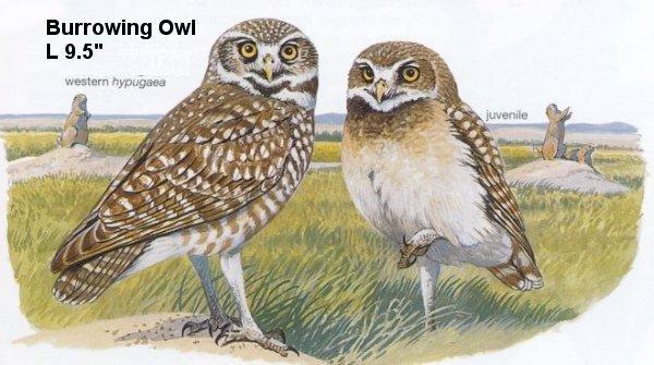 Burrowing Owl Athene cunicularia - A small long-legged diurnal owl of the plains, locally common, usually nesting in prairie dog "towns." Frequently bobs up and down. Perches on the ground or on a fencepost. Hovers when hunting. Distinguished from all other owls except the Barn Owl by sandy color and long legs. Nests in burrows. Calls are a cackling alarm note and, at night, a 2-note coo-c-o-o. |