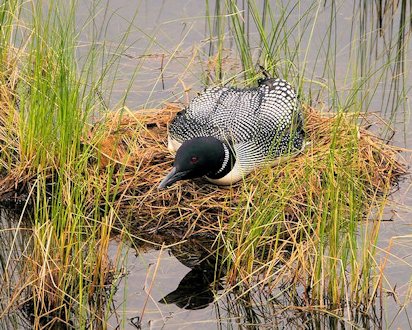 Nest-Site for a Common Loon The Red-cockaded Woodpecker, another nest-site specialist, is adapted for life in a mature pine forest. This bird usually selects a living pine over 75 years old as a nest site. These older trees are often infected with a fungus that softens the heartwood, making their nest excavation easier. Other species are also limited by specific nest-site requirements. For example, Common Loons in Minnesota and other northern states seem best suited to lakes with tiny islands. A loon's legs are at the very back of the body. They are well adapted for swimming underwater, but they are not much use for walking on land. A loon must nest on the ground where it can easily slip in and out of the water. Unless on an island, its nests are quite vulnerable. |