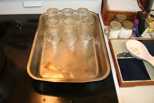 Heat the Jars Paul puts the jars we will use inverted in a shallow pan with an inch of water. He will turn on the heat in a moderate temperature so the water will gently boil. This sterilizes and heats the jars. You should not put hot jam in a cold jar. We will put our jam in half pints. You may have to tip the jars from time to time in case the water is all drawn up into the jars. ⇦ Back to - Step 9 On to - Step 11 ⇨Return to Pear Jam - Page 2 |