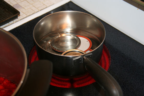 Canning Strawberry Jam 7. Heat Lids Paul puts the lids in a small pan of water and turns on the heat under them. To help keep them from sticking together we alternate the lids top side up and down. Authorities warn against boiling them. We just put heat under them and turn off the heat when they boil. Keep them in the water until used. ⇦ Back to - Step 6 On to - Step 8 ⇨Back to Strawberry Jam - Page 1 |