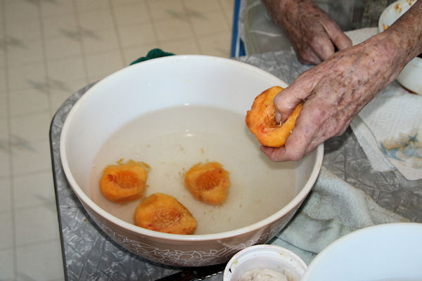 Hold Peaches in Salted Water When Bernice is satisfied the peach is finished she puts it into a bowl of slightly salted water. It will sit here until there is enough to start the next step of blending the peaches. Paul will empty it into the blender container. ⇦ Back to - Step 7 On to - Step 9 ⇨Return to Peach Nectar - Page 1 |