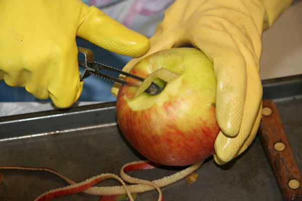 After washing the apple we slightly peel each end. That will make the job with the apple peeler go easier.