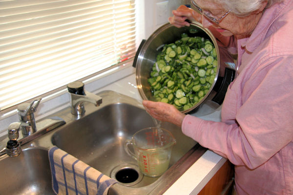 24 Steps to Can Bread 'n Butter Pickles Step 9, Pour off the Brine After you have collected your pot of batches with the onions and salt mixed in, you will need to wait for 3 hours for the action of the salt to take place. This three batches of cucumbers rendered out some 8 cups of liquid. Here we pour out that liquid. We pour here into a 4 cup measuring cup to give you an idea of how much liquid will be removed by the action of the salt. Normally we would use a colander to catch any slices that escape in this step. After the photo was taken Paul took over the step but used Bernice's additional two hands to keep the slices from all tumbling out into the sink. ⇦ Back to Step 8 On to Step 10 ⇨Back to Pickles Steps - Page 2 |