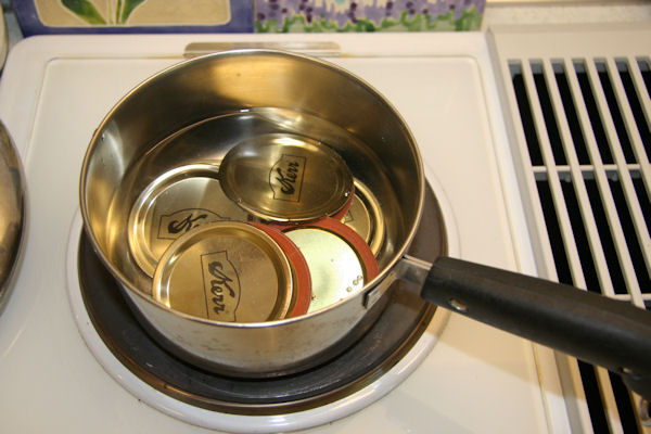 24 Steps to Can Bread 'n Butter Pickles Step 13, Boil the Lids Some authorities suggest not boiling the lids. We do boil ours. Your choice. Just bring them to a boil and take them off the heat. When we put them into the small pot we alternate the direction so they don't stick together so much. ⇦ Back to Step 12 On to Step 14 ⇨Back to Pickles Steps - Page 2 |