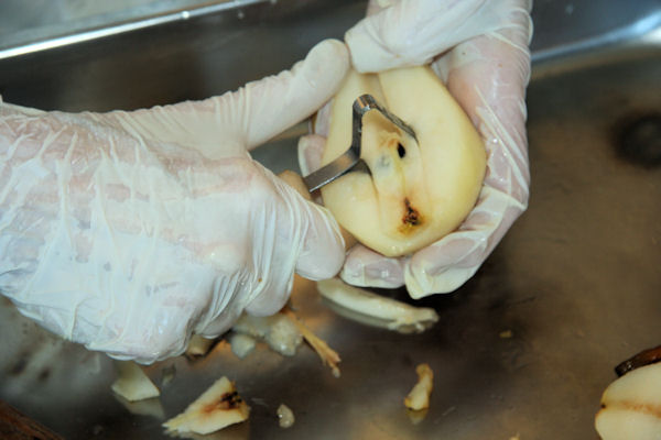 Canning Pears Removing the Core - 14 Next Bernice uses the large end of the pear tool to remove the core at the big end of the pear. When finished with each half she puts them in the bowl with the salted water in it. ⇦ Back to - Step 13 On to - Step 15 ⇨Back to Pears - Page 2 |