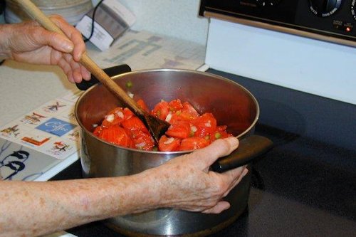 12 Steps to Canning Stewed Tomatoes Step 7, Boil Everything 10 Minutes After we have completed a batch, put all vegetables into a pot with some salt and sugar. Add salt and sugar to your taste. You can use neither if you wish. Bring it to a boil on medium heat, stirring constantly to prevent sticking. Boil for 10 minutes. ⇦ Back to Step 6 On to Step 8 ⇨Back to Stewed Tomatoes Page 2 |