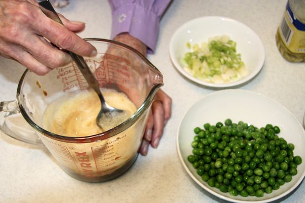 We use a spoon to mix well the egg mixture. Nearby we had measured out a cup of frozen peas into a small bowl and set them out to thaw.