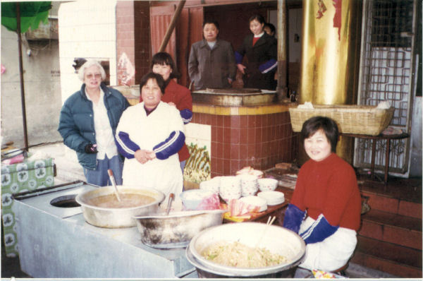 Restaurant Shop These ladies run a small restaurant. In front are the coal-fired boiling pots of sauces used to flavor the dishes such as noodles they serve. Inside on the ground floor are about 8 tables. We often stop here for a bowl of noodles and a dish of hot fried peanuts after Church on Sundays. They have two rooms upstairs if you want some quiet with your food. We go to Church with 3 students and then buy everyone lunch here. For the five of us, we pay about 3 dollars US, including tea. On to Kitchen 13 ⇨ ⇦ Back to Kitchen 11Hi Res Picture (138K) Return to Kitchens - Page 2 |