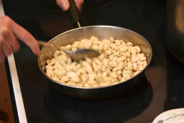 Fry the Peanuts We use about a quarter inch of canola oil to fry the peanuts. Heat the oil first and then add the peanuts. We stir constantly as they cook. It doesn't take long. Keeping them moving will allow them to cook evenly. If you don't the ones on the bottom will get too brown quickly. ⇦ Back to Step 2 On to Step 4 ⇨Return to Peanuts Thumbs |