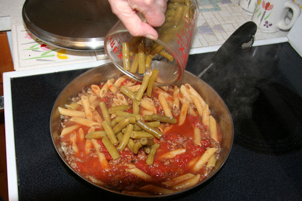 Making Greek Skillet Dinner 15. Add Green Beans Add 1 1/2 cups of green beans to the skillet. You can use frozen cut green beans. We can green beans every year so we used those. Either one will do. Stir them in well. ⇦ Back to Step 14 On to Step 16 ⇨Return to Greek Skillet Dinner - Page 2 |