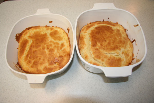 Here are the two casseroles ready for the chow hounds. One we will put on the cover and put into the freezer for later use. Let's eat.