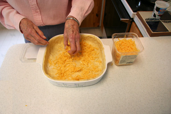 Sprinkle Cheese After Bernice has lined the casserole dish covering the bottom and sides she sprinkles some of the grated Cheddar cheese on the bottom. ⇦ Back to Step 8 On to Step 10 ⇨Return to Fiesta Casserole - Page 2 |