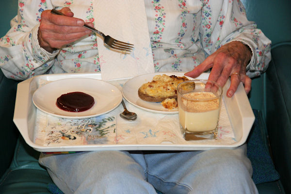 Cooking Stuffed Spuds 22. Bernice Tries One We prepare a tray with a stuffed potato, a slice of cranberry sauce and a glass of eggnog for Bernice. Paul takes a photo and then tries his stuffed potato. Both of us declare it to be quite scrumptious and tasty. Good too! ⇦ Back to Step 21 On to Step 23 ⇨Return to Stuffed Spuds - Page 3 |