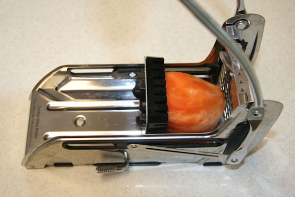 Making Shoestring Sweet Potatoes 7. Place Potato in Cutter We had cut the sweet potato in half. Place the potato with the pointed end towards the cutter and arrange the cut end flat against the pushing bar as shown. Pushing down on the lever will propel the potato through the cutting blades. ⇦ Back to Step 6 On to Step 8 ⇨Return to Shoestring Sweet Potatoes - Page 1 |