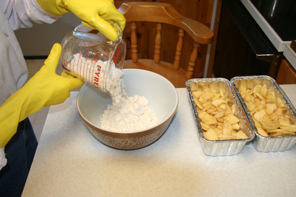 We put the baking mix in a large bowl to start preparing our topping for the cobbler.