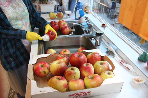 Making Apple Crisp Wash Apples - 1 The first thing we do is to wash the apples in slightly warm clear water. Bernice will rub the apples with her hand or brush as she feels is needed. As she washes each apple she puts them in the tray to the left. It is important to use the brush at each end of the apple. Often debris and dirt lie in these ends. On to - Step 2 Back to - Step 24Back to Apple Crisp - Page 1 |