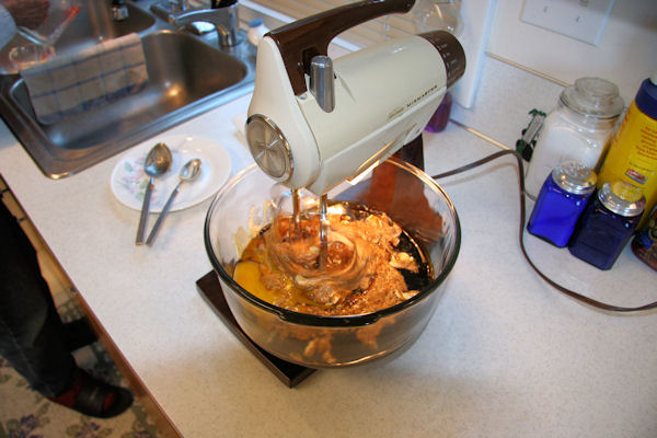 Ready to Mix We have the eggs, shortening, sugar and molasses in the mixing bowl. We are now ready to mix it up with the power mixer. We start off at low speed. We use a spoon to scrape the sides into the center. We just hold the spoon steady and use the motion of the bowl to do this. ⇦ Back to Step 5 On to Step 7 ⇨Return to Gingerbread Men - Page 1 |