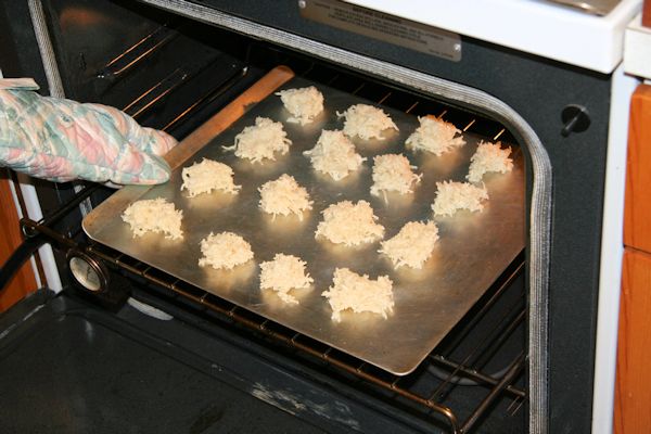 Making Macaroons 19. Into the Oven We put our cookie sheet into the preheated oven (325 degrees F). They will need to bake 7 to 10 minutes. Don't stray off now. Take out when the tops have some golden brown color. ⇦ Back to Step 18 On to Step 20 ⇨Return to Macaroons - Page 3 |