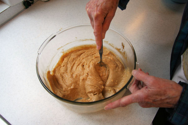 Molasses Cookies -- Step 4 Mix the Non Dry Ingredients We use a large tablespoon to mix the ingredients. We have found using the back of the spoon seems to work the best. Paul's Mom let her three boys make cookies whenever they wanted cookies but they had to do it. She would do the cleanup. Paul now lets Bernice have that fun job. ⇦ Back to Step 3 On to Step 5 ⇨Return to Molasses Cookies Page 1 |