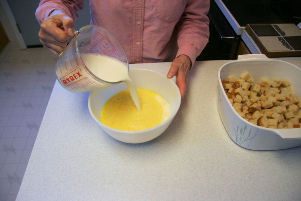 After the eggs are beaten we add the 2 and a half cups of milk. Just measure and pour it in.