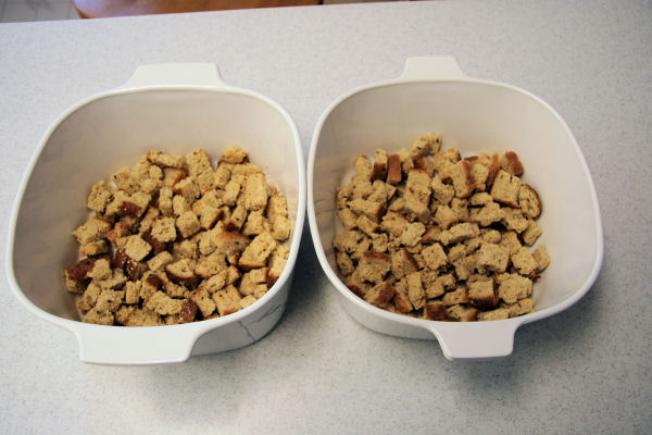 Bernice then divided the dried bread cubes evenly into the two oiled dishes.