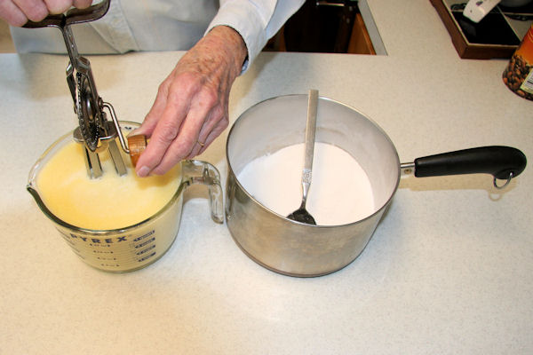 We take a minute to use our hand mixer to mix the eggs and milk.