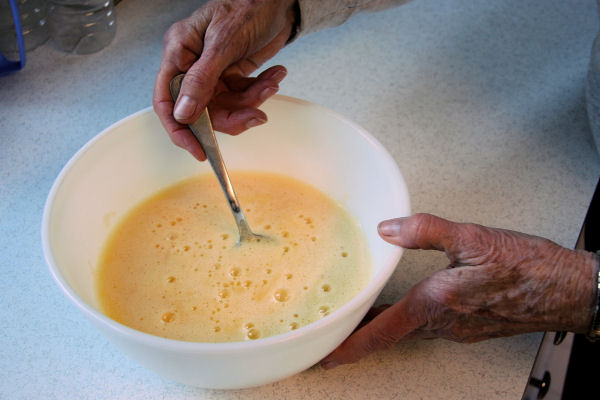 Mix all the Liquids We now combine the 1 1/2 cups of sugar, 3/4 cup of pineapple juice from draining the can of pineapple, and 2 teaspoons of coconut extract in the mixing bowl. Then we mix it the best we can with a large tablespoon. ⇦ Back to Step 6 On to Step 8 ⇨Return to Pineapple Cake Page 1 |