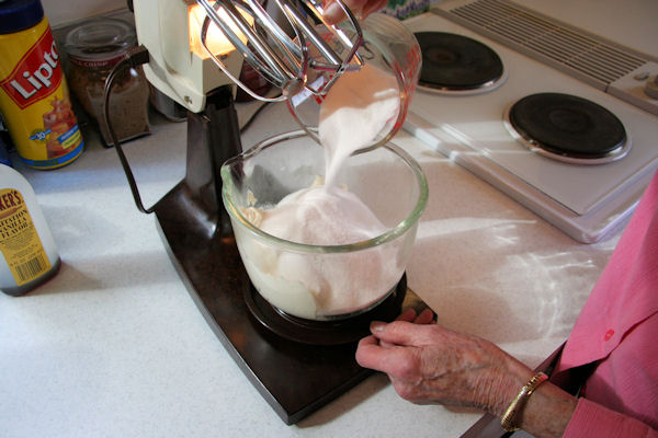 Add 1/2 cup of sugar to the mixer with the cream cheese. We save the remaining 1/4 cup to later add to the pumpkin mix.